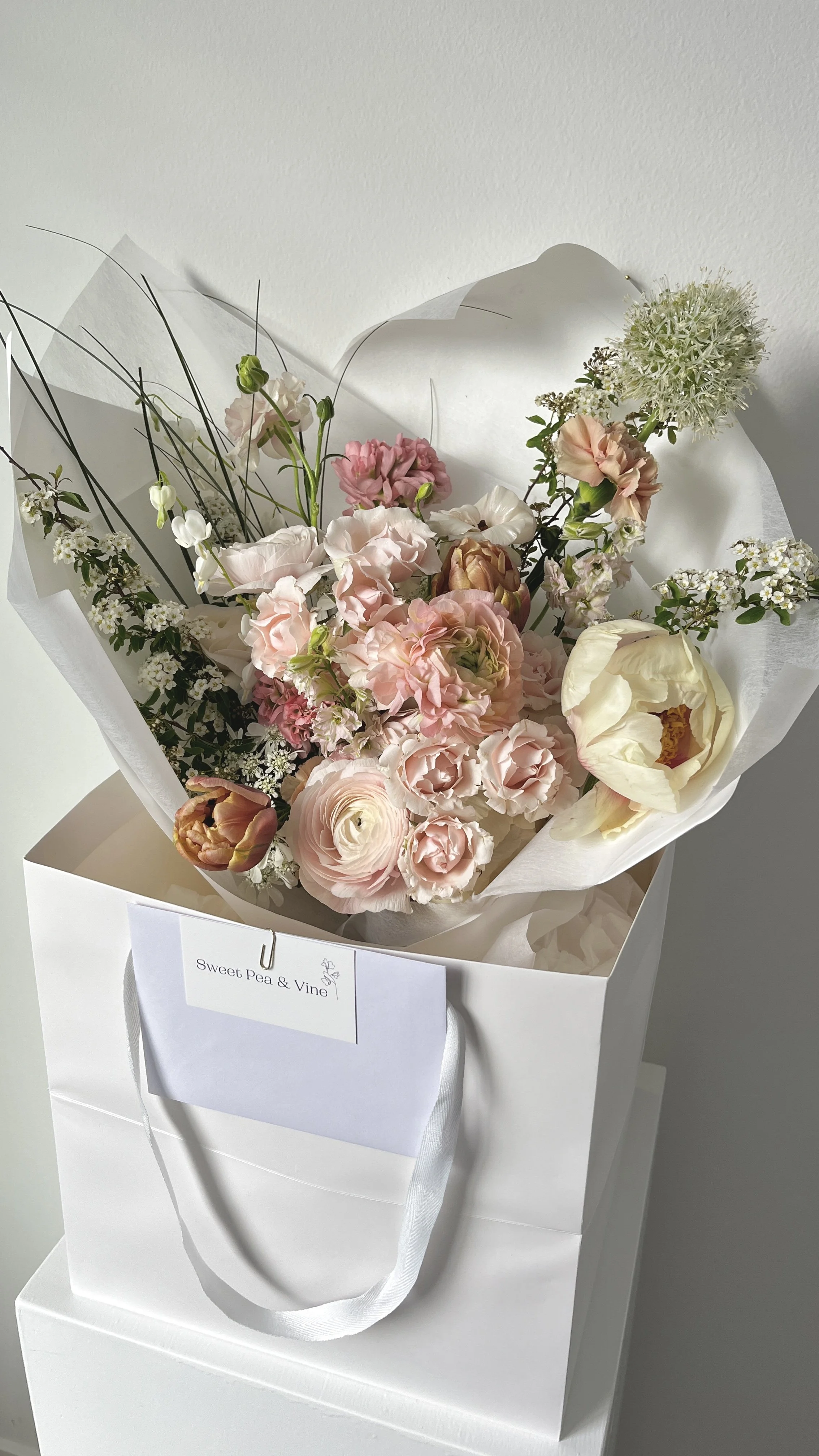 Our all-time most popular choice! The SP&V hand-tied bouquet showcases a beautiful mix of seasonal and premium flowers wrapped in white paper and finished with either our logo-printed ribbon or a coordinating colored ribbon. Each hand-tied bouquet is a bespoke creation intentionally designed for each recipient and their special occasion.